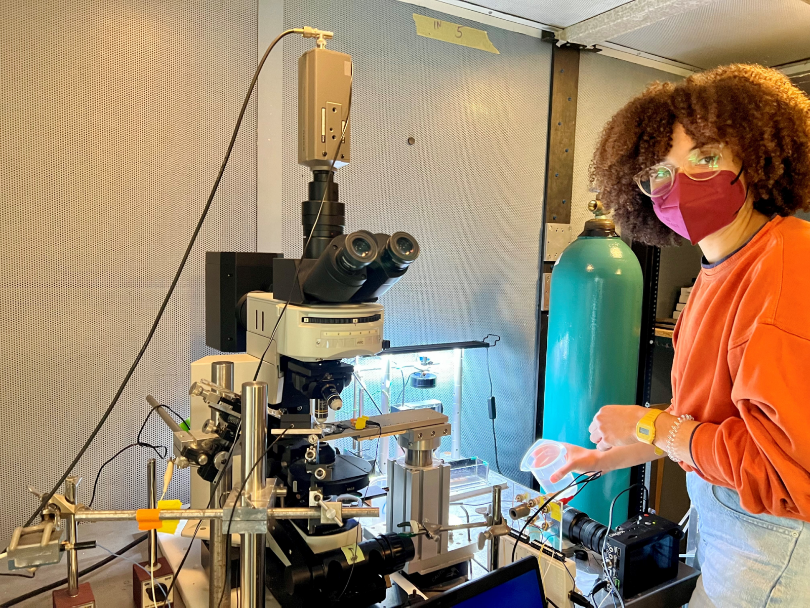 "The main goal of my secondment was to compare the vocalisations of the Danionella dracula at the Bass Lab with that of our Danioenella cerebrum. Using a high-speed video camera, I recorded the fish while they vocalised and was able to see the movement of the swim bladder during sound production. Although they are a closely related species with similar morphology, the structure of the sounds they produce are very different. Going forward, it will be interesting to see how this reflects the similarities and differences in their vocal-motor neural circuits."